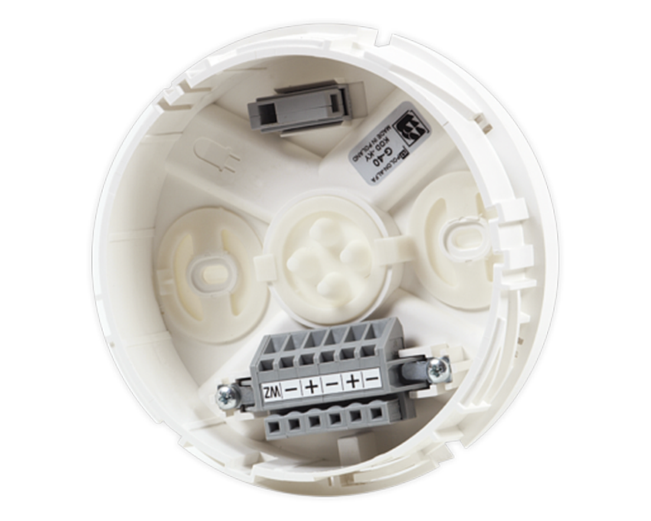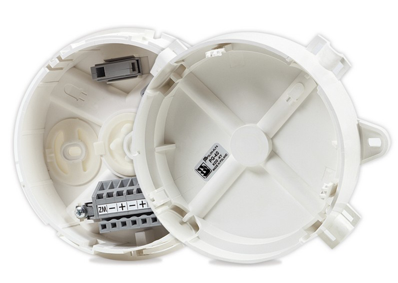 Gniazdo G-40 służy do montażu czujek serii 40, 4000 i 6000 (m.in. DOR-40, DPR-4046, DUO-6046) oraz podłączania ich do linii dozorowej. Po zastosowaniu dodatkowej podstawy PG-40 może być instalowane w miejscach, gdzie na suficie skrapla się para wodna lub gdzie konieczny jest montaż na linkach nośnych. Dzięki podstawie PG-40 z dławikiem PG7 gniazdo można również przystosować do wersji wiszącej. Dla ochrony czujki przewidziano stalową osłonę OZ-40.
