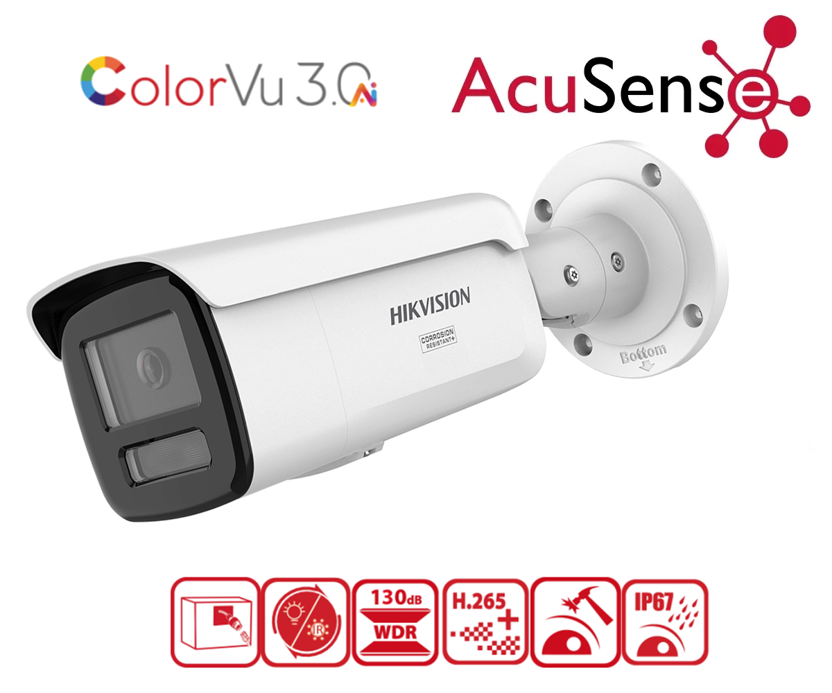 Kamera Hikvision DS-2CD2647G3T-LIZSY to zewnętrzny model 4MPx (2688×1520) z przetwornikiem 1/1,8” CMOS i motoryzowanym obiektywem 2,8–12 mm, oferującym szeroki zakres kąta widzenia. Dzięki bardzo wysokiej czułości (0,0005 lux) oraz hybrydowemu doświetleniu IR i światłem białym zapewnia skuteczny monitoring nocny do ok. 60 m.