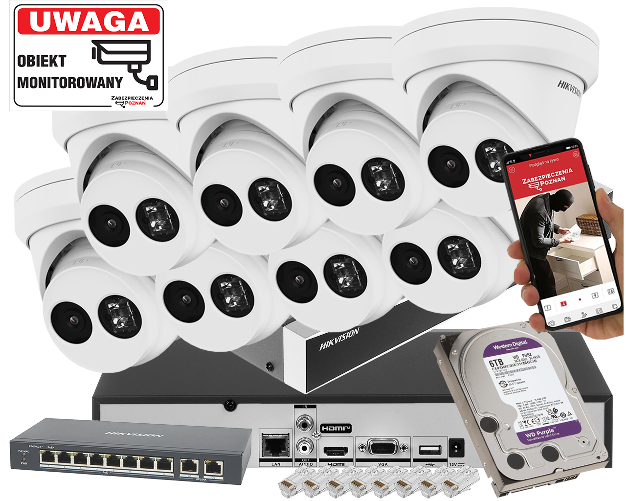 Nowoczesny zestaw monitoringu Hikvision z 8 kamerami IP w wysokiej rozdzielczości 2K Quad HD w technologii Acusense z zasilaniem PoE