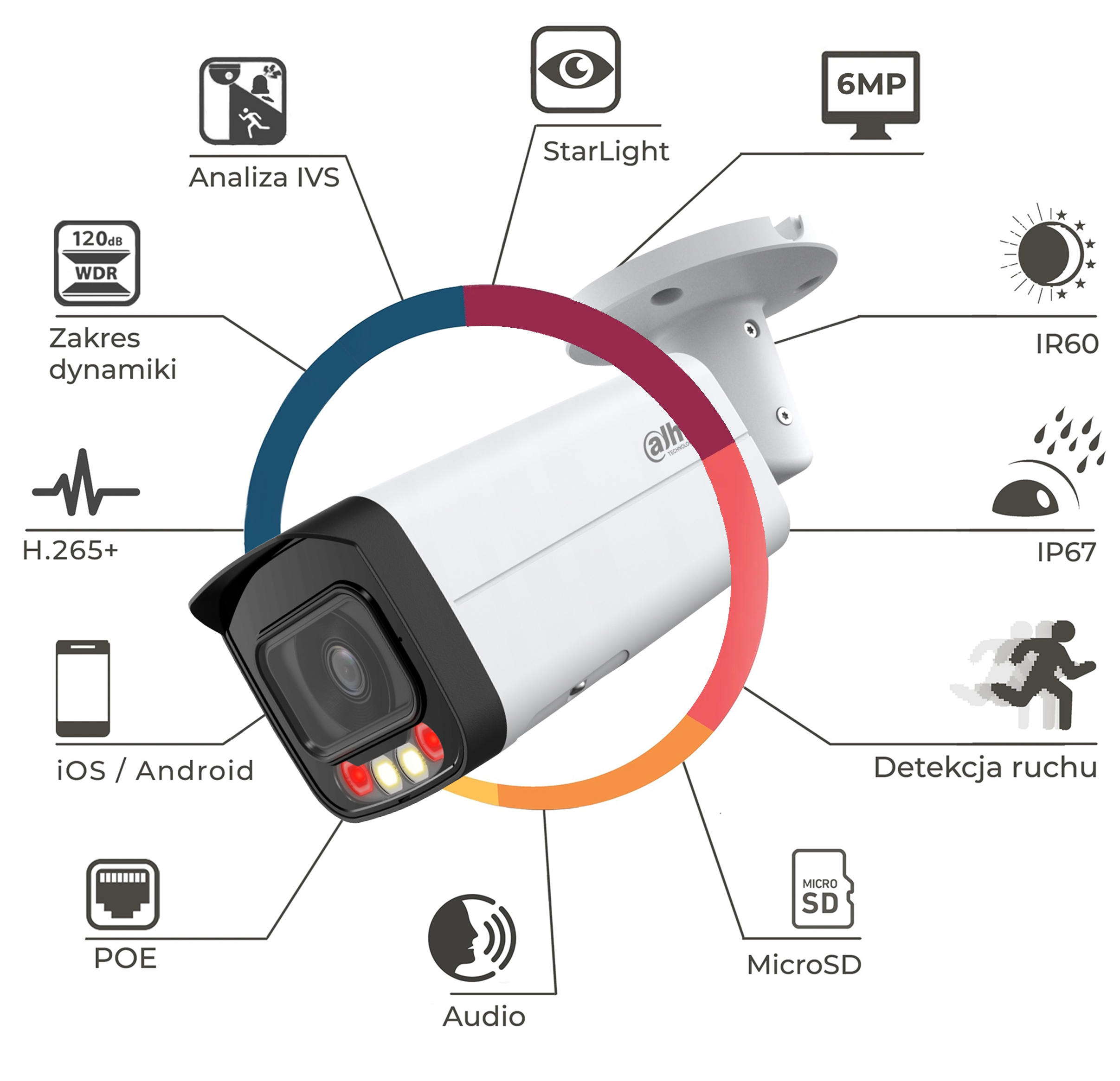Kamera Dahua IPC-HFW2649T-ZAS-IL-27135 należy do innowacyjnej serii WizSense, wprowadzonej na rynek przez Dahua Technology. Seria ta obejmuje produkty i rozwiązania AI oparte na niezależnym chipie AI oraz algorytmie głębokiego uczenia, które koncentrują się na ludziach i pojazdach z wysoką dokładnością. Umożliwia to szybkie reagowanie na określone cele i zagrożenia.