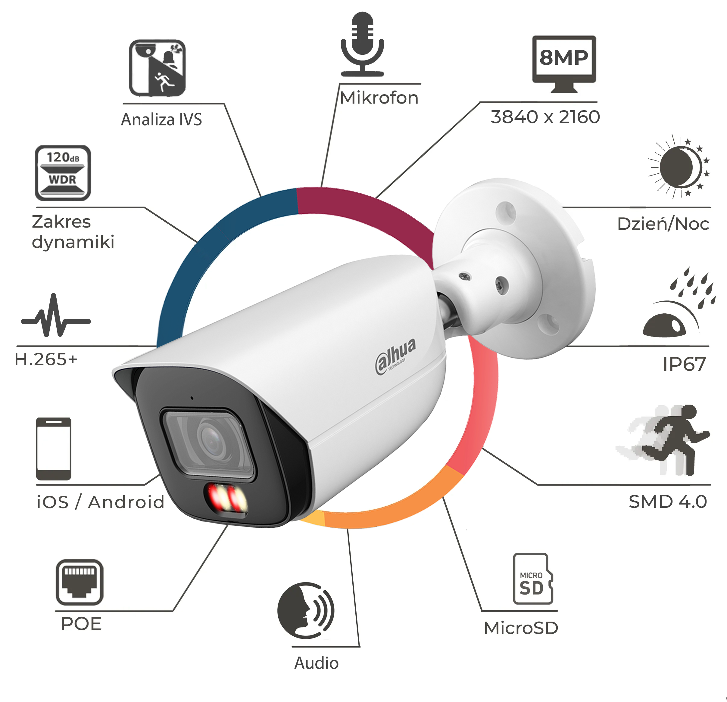 Dahua WizSense IPC-HFW3849E-AS-IL to kamera IP 4K, która łączy najwyższą jakość obrazu z inteligentnymi funkcjami AI. Dzięki technologii Smart Dual Light automatycznie przełącza się między IR a światłem LED, zapewniając pełną widoczność w dzień i w nocy. Wbudowane algorytmy IVS i SMD 4.0 precyzyjnie wykrywają ludzi i pojazdy, eliminując fałszywe alarmy. Solidna obudowa IP67 gwarantuje niezawodność w każdych warunkach.