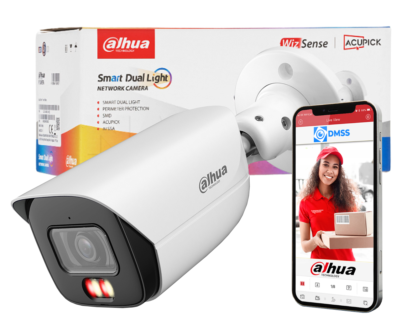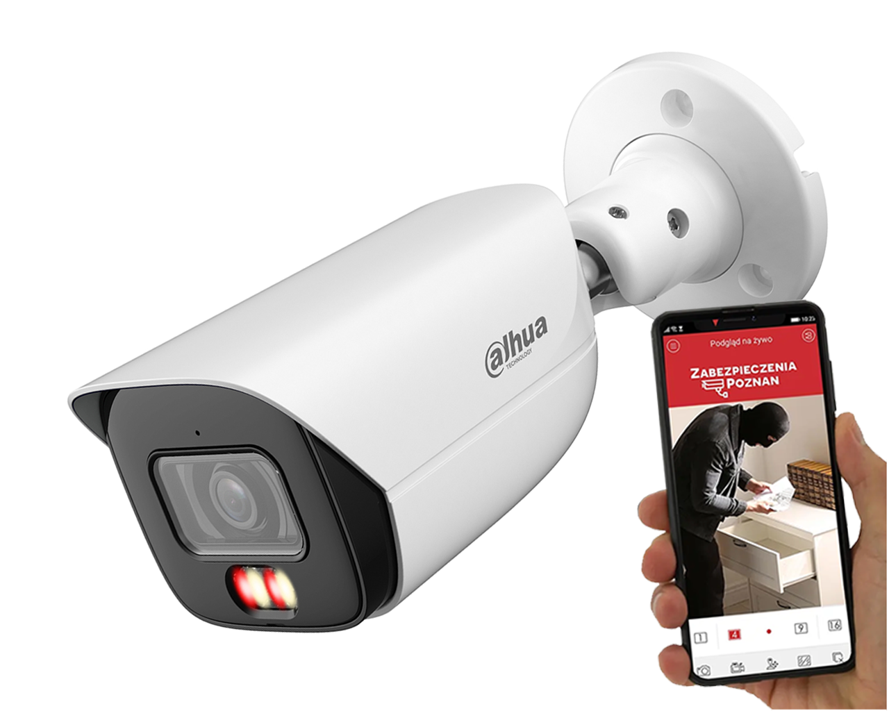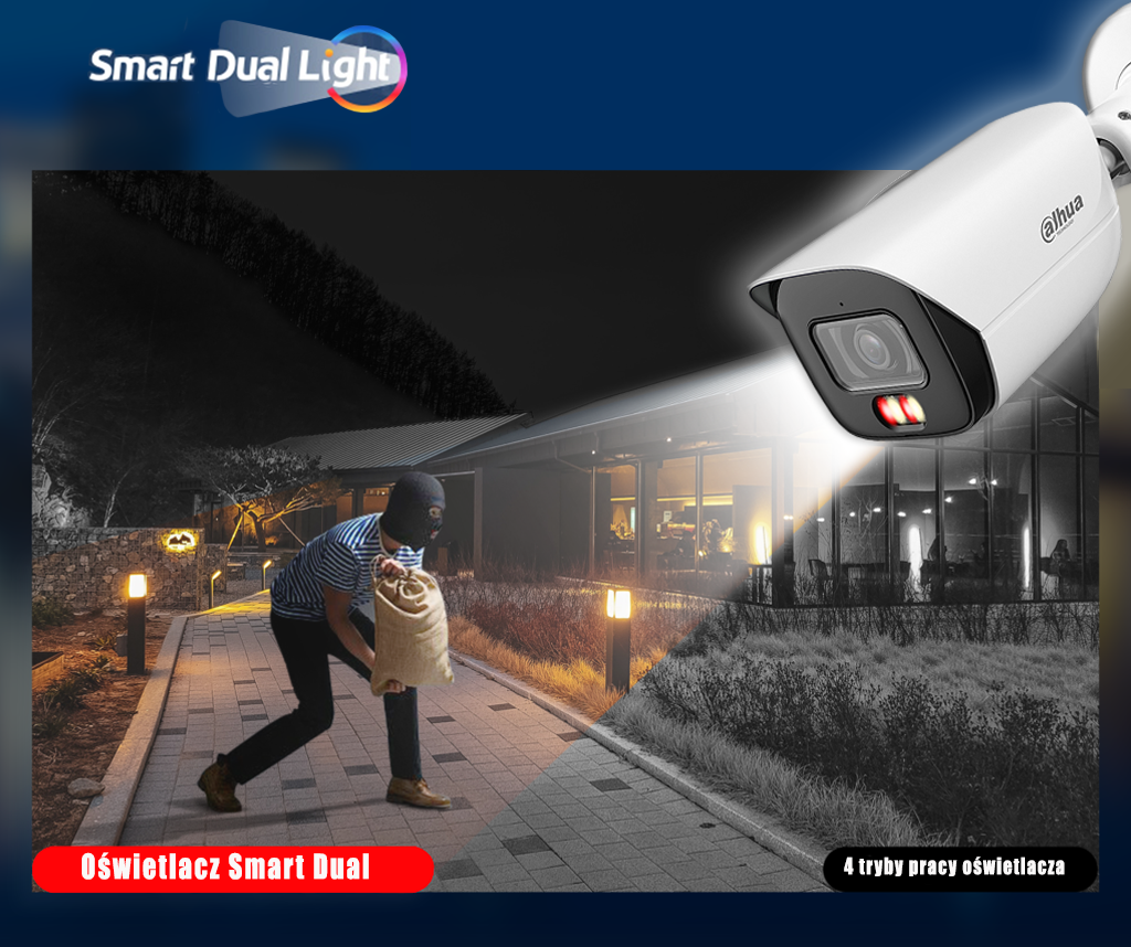 Kamera IPC-HFW3849E-AS-IL-0280B wyposażona w technologię Smart Dual Illumination, automatyczną regulacje mocy oświetlacza w celu uniknięcia prześwietlenia obrazu. Użytkownik ma możliwość wyboru między trybem światła białego LED (24/h kolor) a trybem podczerwieni IR.