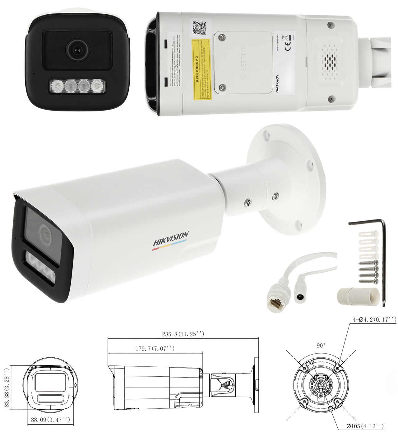 Stałoogniskowy obiektyw 2,8 mm gwarantuje szeroką perspektywę, a hybrydowy system doświetlania — podczerwienią i światłem białym — działa na dystansie do 50 m. Kamera spełnia normę IP67, posiada funkcję Motion Detection 3.0 z możliwością wykrywania ludzi oraz pojazdów, a także oferuje zapis nagrań na karcie microSD o pojemności do 512 GB.