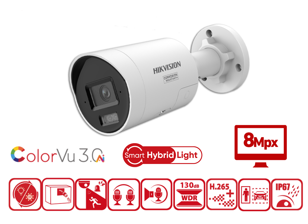Kamera Hikvision DS-2CD2087G3-LI2UY/SRB to nowoczesna kamera IP z serii Smart Hybrid Light, oferująca wysoką jakość obrazu i inteligentne funkcje ochrony. Ma stały obiektyw oraz dwa rodzaje oświetlenia – światło białe i podczerwień. Dzięki technologii ColorVu 3.0 zapewnia kolorowy obraz nawet w nocy, a AcuSense 2.0 i Live Guard wykorzystują sztuczną inteligencję do rozpoznawania ludzi i pojazdów oraz aktywnego odstraszania intruzów.