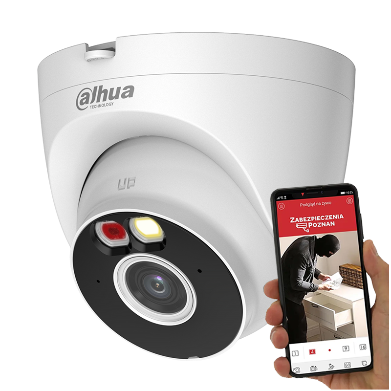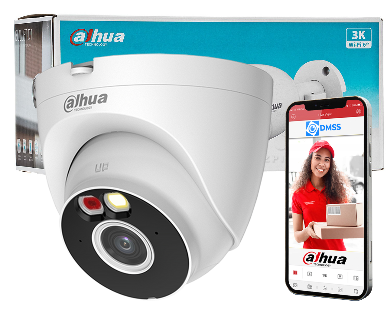 Kamera Dahua T5A-PV-0280B to nowoczesna kamera zewnętrzna o rozdzielczości 5 Mpx, zapewniająca wyraźny obraz w dzień i w nocy. Dzięki Wi-Fi 6 (2,4 GHz) łączy się bezprzewodowo z siecią – bez potrzeby prowadzenia kabli.