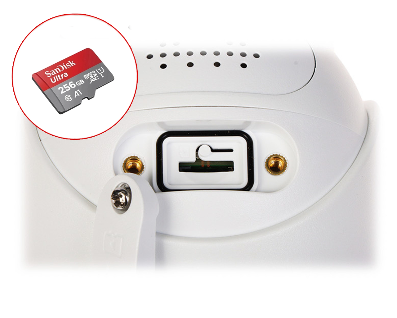 Kamera posiada również slot na karty microSD do 256 GB, dzięki czemu kamera nie wymaga dodatkowego rejestratora, by nagrywać obraz. Po przekroczeniu limitu pamięci, kamera automatycznie nadpisuje najstarsze nagrania. Pojemność 256 GB wystarcza na ok. 6 dni ciągłego nagrywania w 20 kl/s.