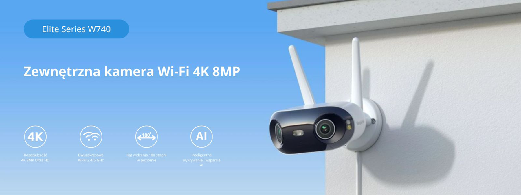 Kamera W740 oferuje ultraszeroki widok panoramiczny 180° oraz wyraźny obraz 4K 8MPx z kolorowym noktowizorem, zapewniając pełne pokrycie monitorowanego terenu bez martwych stref. Dwuzakresowe Wi-Fi 6 umożliwia stabilny i płynny podgląd na żywo, a nagrywanie 24/7 gwarantuje stałą kontrolę nad otoczeniem.