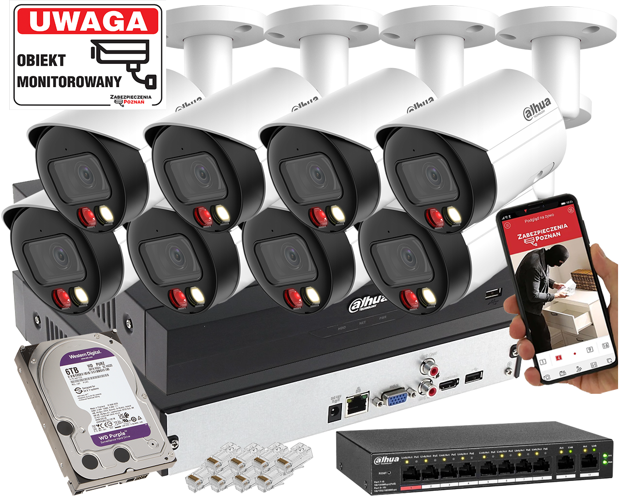 Prezentowany zestaw składa się z 8 kamer Dahua IPC-HFW2449S-S-IL-0280B z serii WizSense S2 to profesjonalne kamery IP z inteligentną analizą obrazu. Wyposażone w obiektyw 2.8 mm i przetwornik 1/2.7” CMOS o rozdzielczości 4Mpx, obsługują kompresję H.265/H.264/MJPEG.