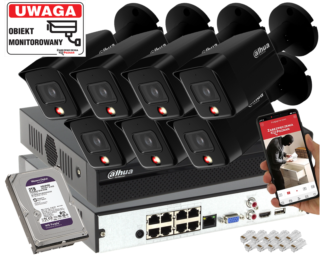System monitoringu podwórka 7 kamer IP Dahua IPC-HFW1639TC-A-IL-0280B-S6 BLACK 6MPx Podwójny oświetlacz