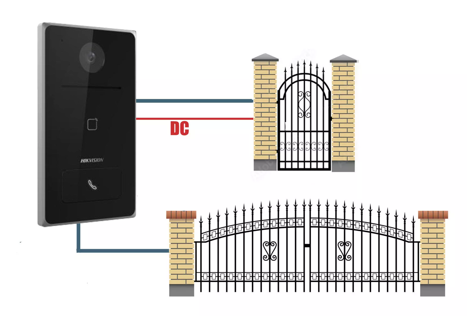 Dzięki dwóm niezależnym przekaźnikom zainstalowanym w stacji bramowej HikVision DS-KV6133-WME1/Surface mamy możliwość sterowania dwoma wejściami (furtka i brama) - opcja dostępna jest także z poziomu aplikacji Hikconnect na telefonie.