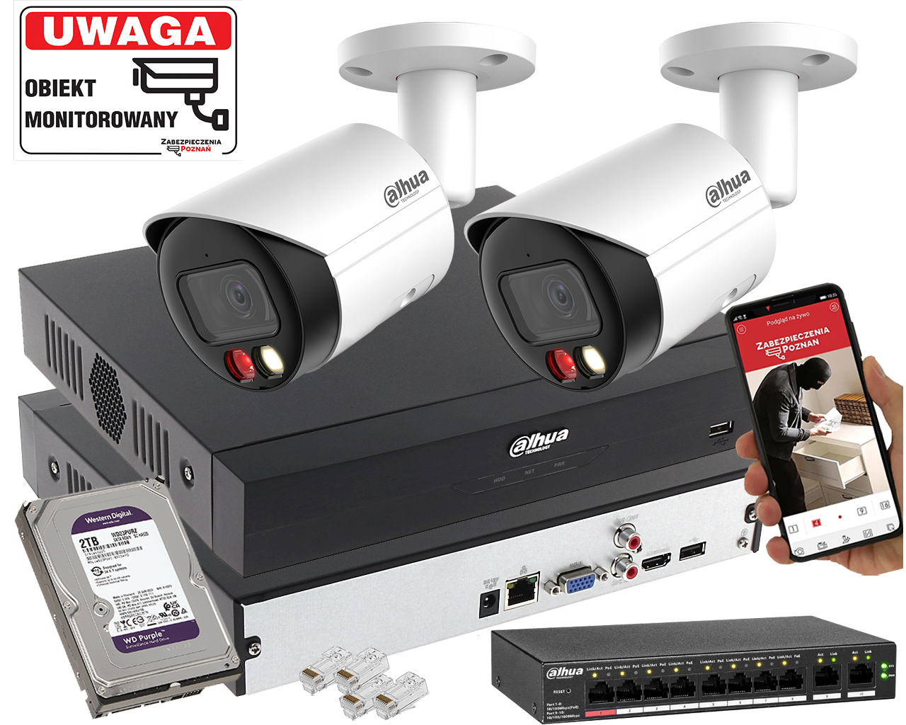 Prezentowany zestaw składa się z 2 kamer Dahua IPC-HFW2449S-S-IL-0280B z serii WizSense S2 to profesjonalne kamery IP z inteligentną analizą obrazu. Wyposażone w obiektyw 2.8 mm i przetwornik 1/2.7” CMOS o rozdzielczości 4Mpx, obsługują kompresję H.265/H.264/MJPEG.