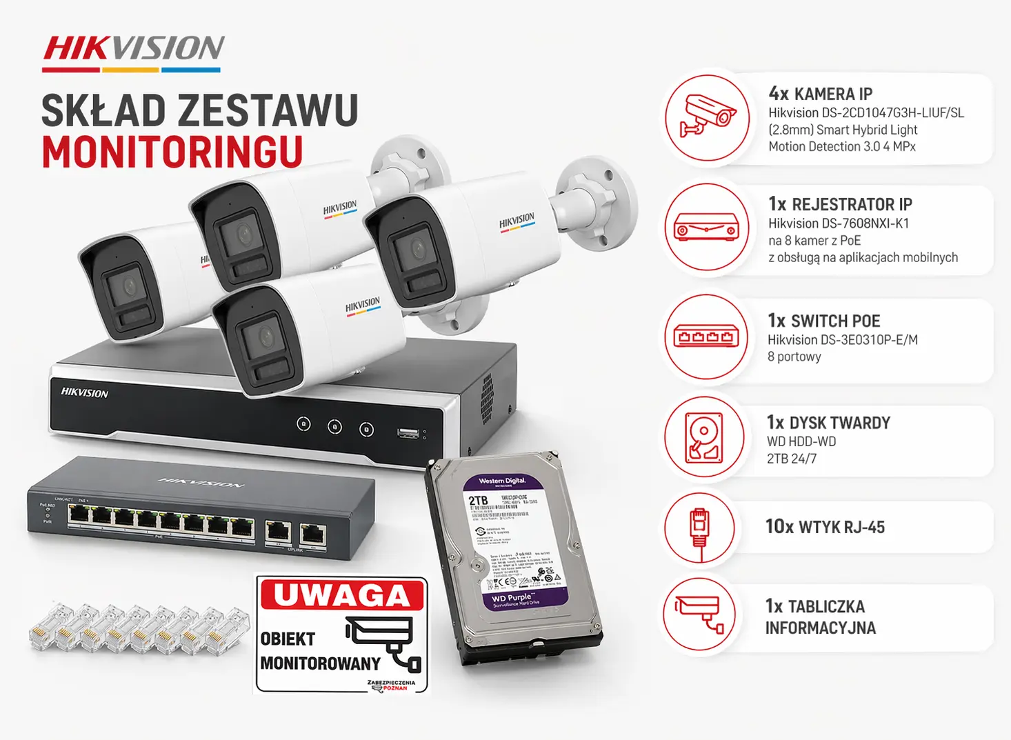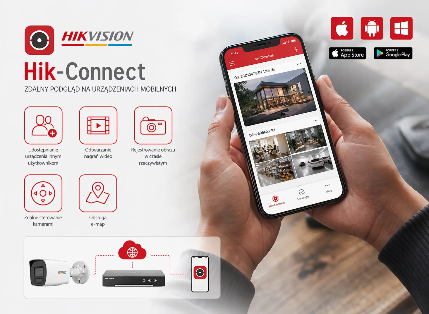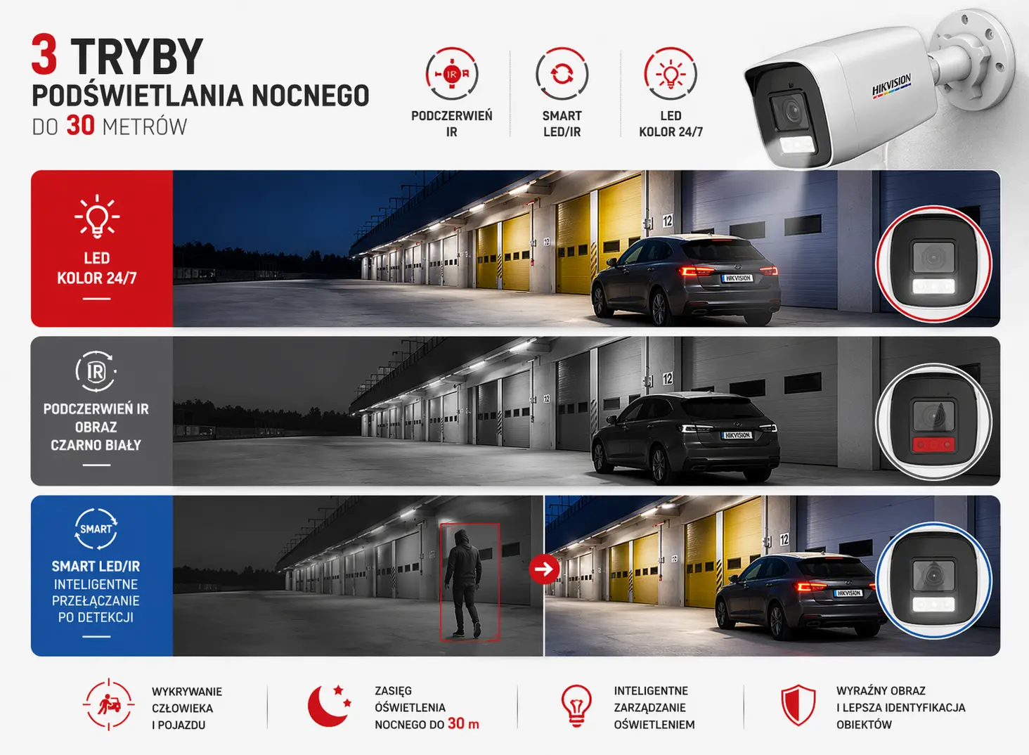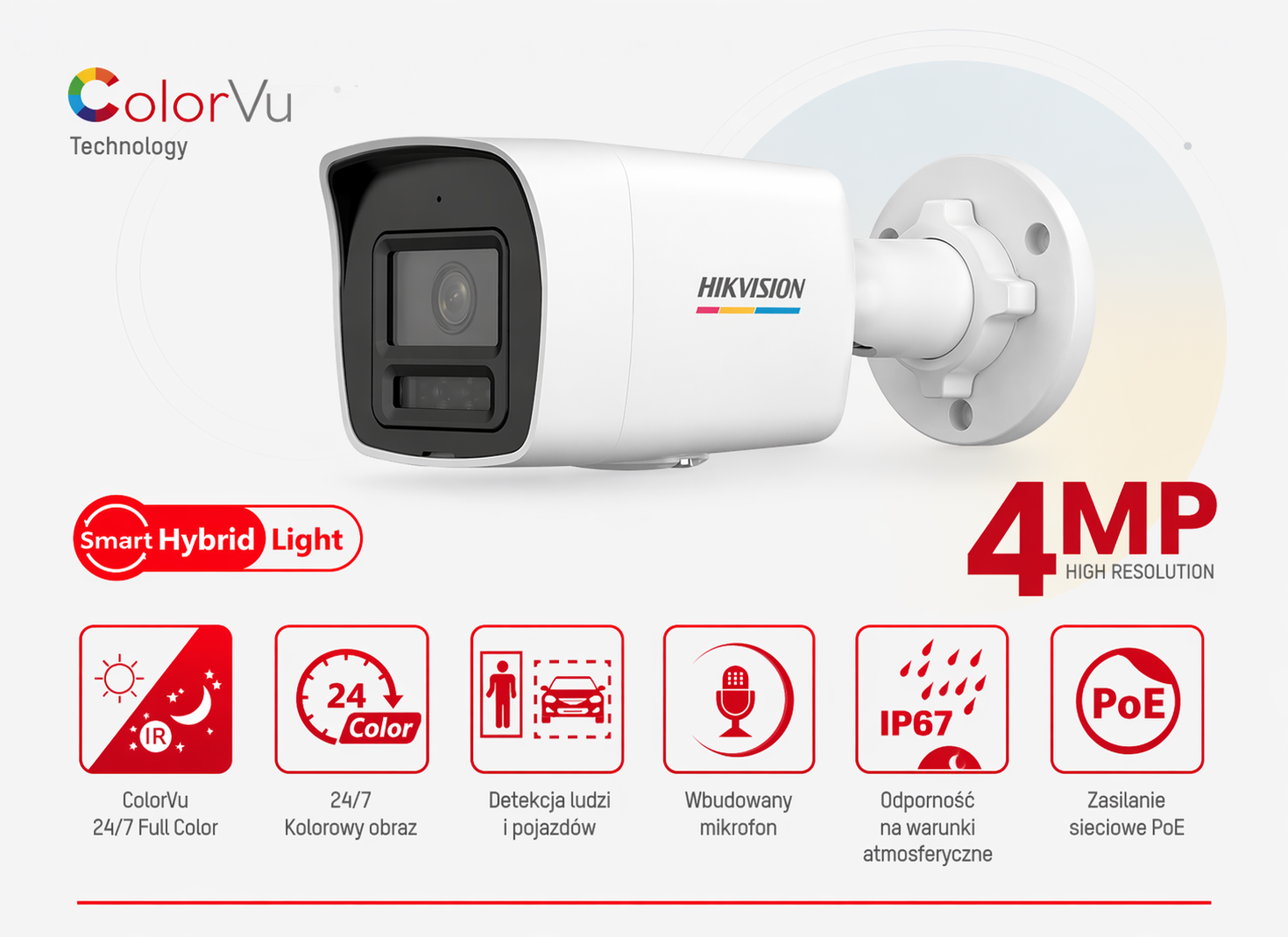 Nowoczesne kamery IP Hikvision zapewniają wyraźny obraz 4 Mpx (2560×1440) zarówno w dzień, jak i w nocy. Dzięki technologii ColorVu oraz Smart Hybrid Light rejestrują obraz w kolorze nawet przy bardzo słabym oświetleniu, automatycznie przełączając tryb pracy po wykryciu osoby lub pojazdu.