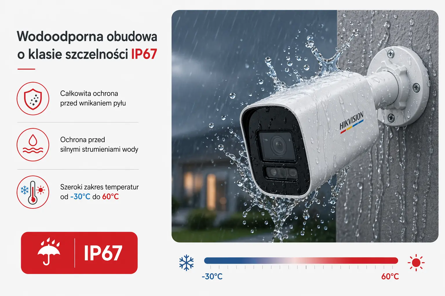 Przy wyborze kamery warto zwrócić uwagę na klasę szczelności. Jest to stopień ochrony kamery przed wpływem czynników zewnętrznych. Dzięki materiałom najwyższej jakości, z których wykonana jest obudowa kamery Hikvision DS-2CD1047G3H-LIUF/SL z klasą IP67 gwarantuje bezawaryjną pracę, chroni całkowicie przed wnikaniem pyłu oraz silnymi strumieniami wody.