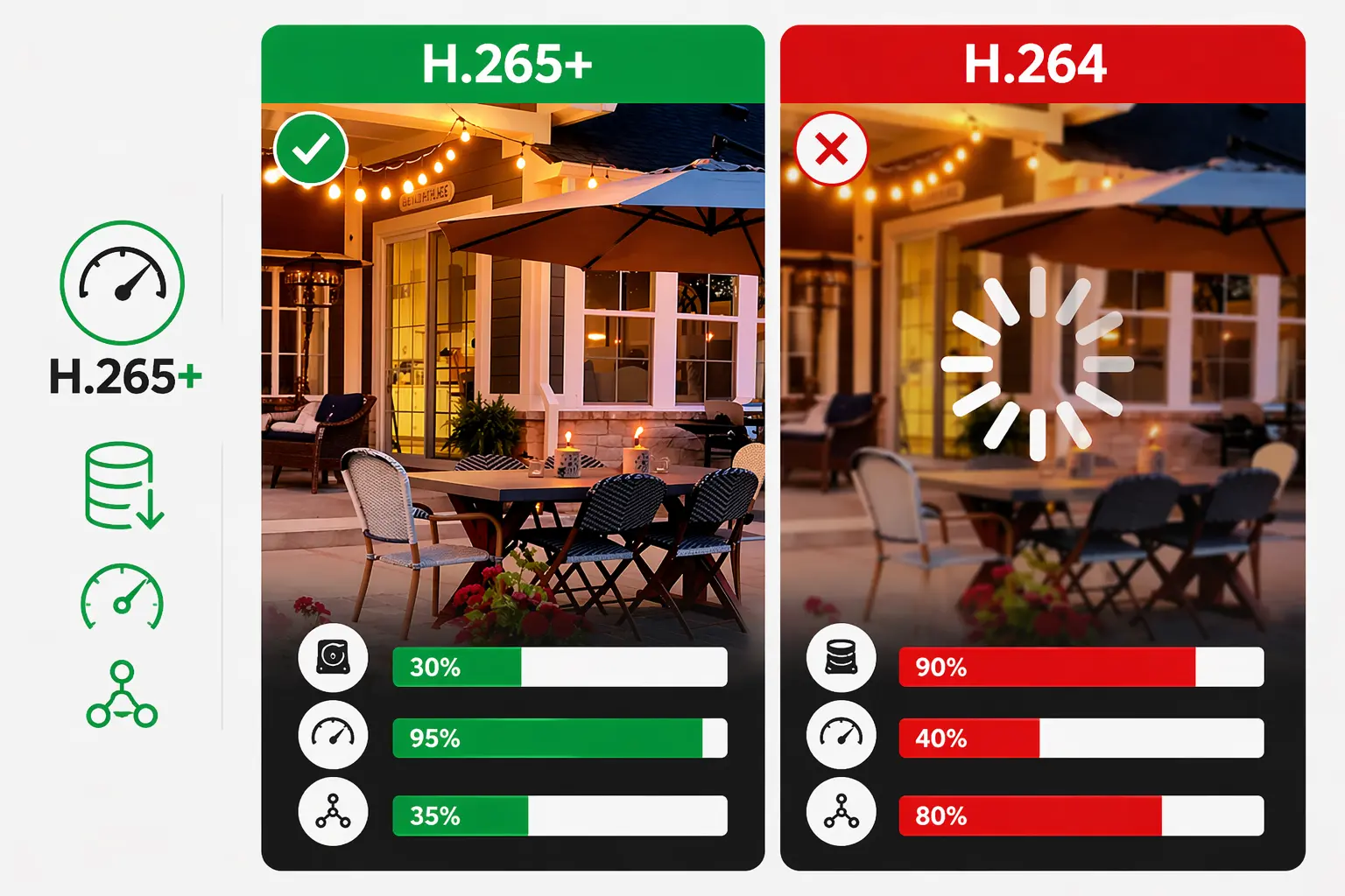 Zastosowanie kodeku H.265+ umożliwia zaoszczędzenie ok. 50% miejsca w stosunku do wersji H.265, a o ponad 90% w stosunku do starszej wersji kodeka - H.264.