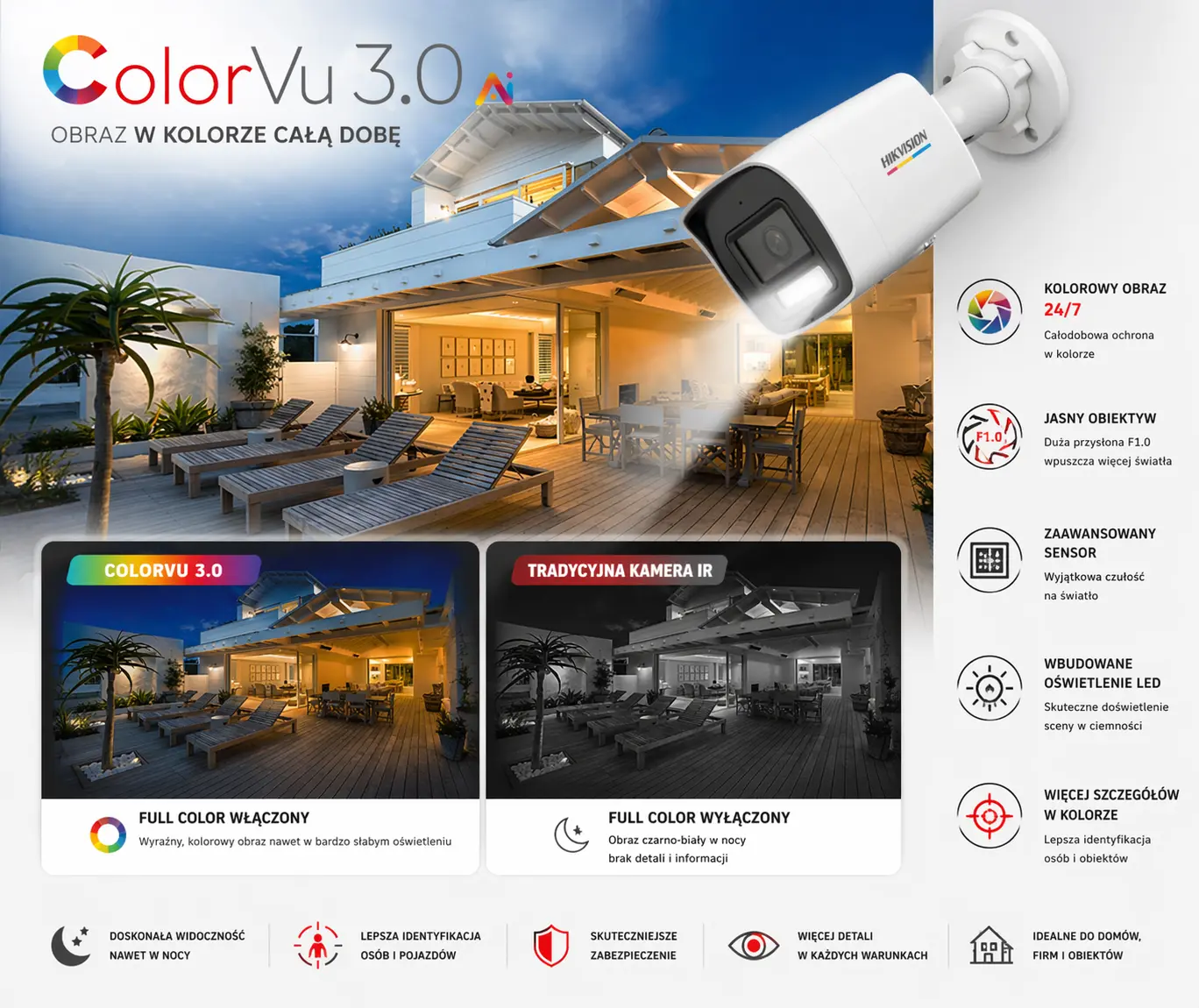 Kamery Hikvision ColorVu 3.0 są wyposażone w zaawansowane sensory i obiektywy z dużymi przysłonami, które umożliwiają rejestrowanie kolorowych obrazów nawet w bardzo słabych warunkach oświetleniowych. To znaczna przewaga nad tradycyjnymi kamerami na podczerwień (IR), które w nocy rejestrują jedynie czarno-białe obrazy.