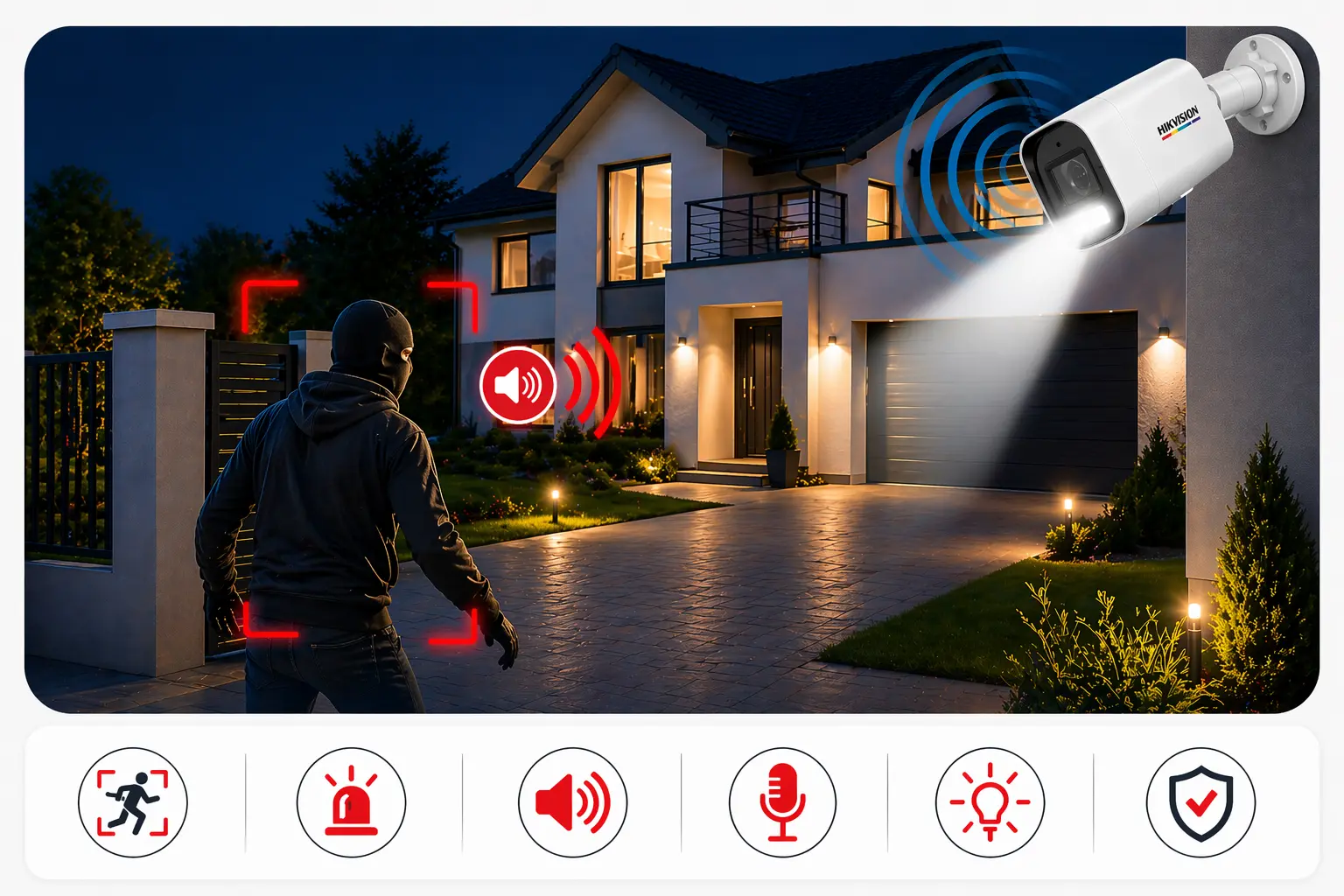 W przypadku wykrycia zagrożenia i uruchomienia alarmu, kamera oferuje możliwość nadawania do intruzów własnych nagranych lub na żywo komunikatów głosowych. Jest to dodatkowe narzędzie w celu zwiększenia skuteczności systemu ochrony i odstraszania intruzów.