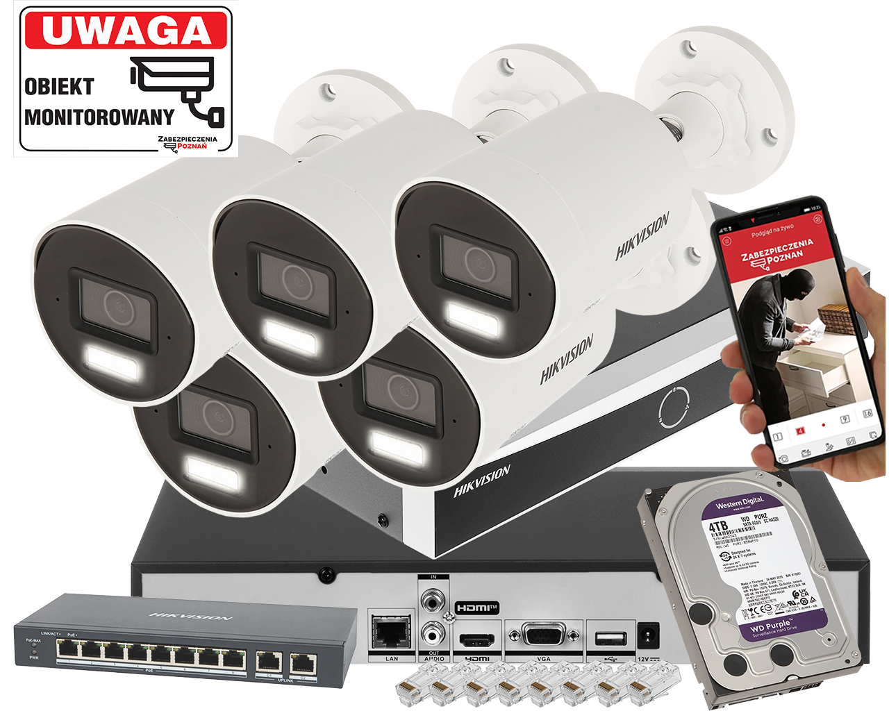 Nowoczesny zestaw monitoringu Hikvision z 5 kamerami DS-2CD2083G2-LI2 IP w wysokiej rozdzielczości 4K Quad HD w technologii Acusense z zasilaniem PoE z oświetlaczem Smart Hybrid Light