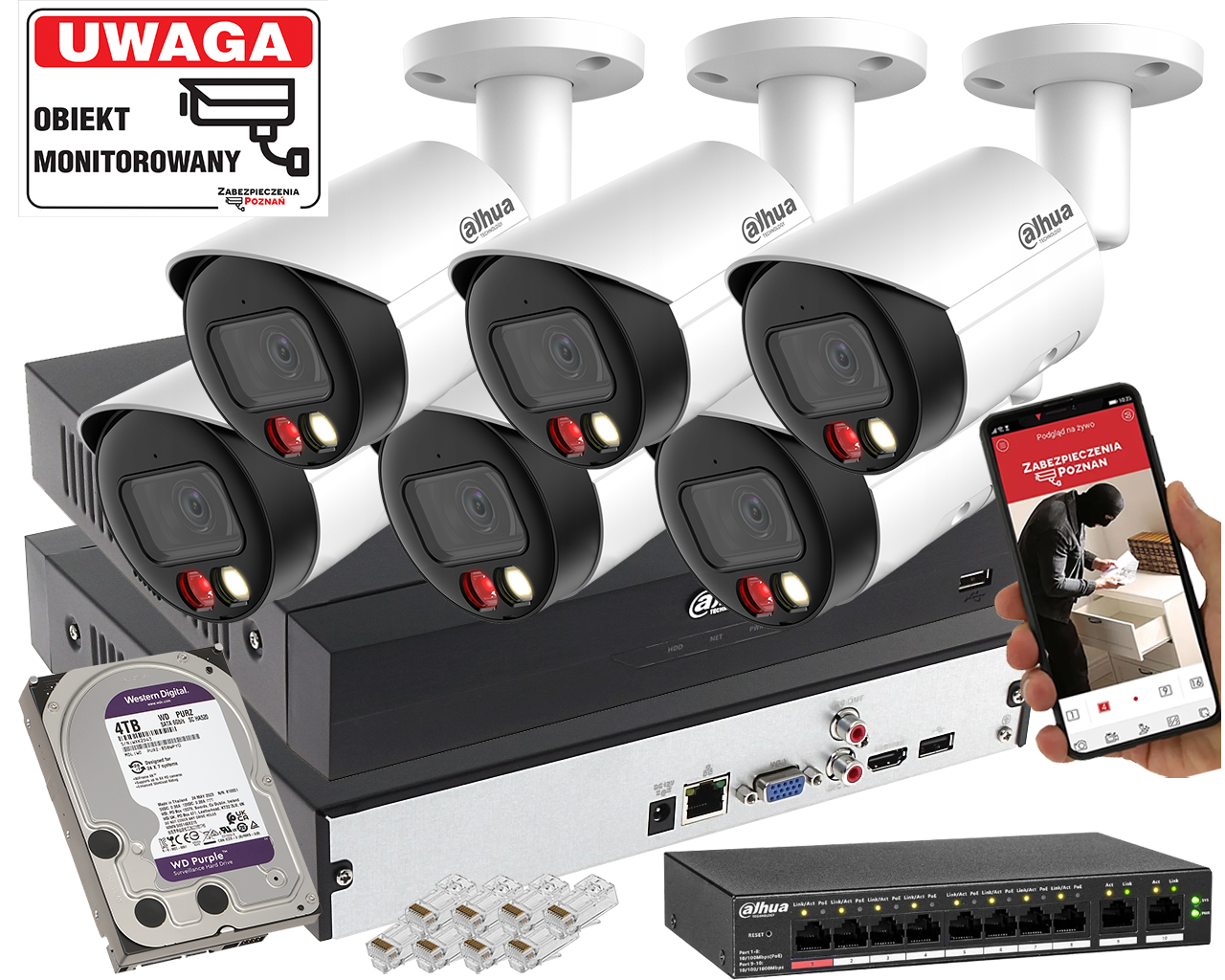 Prezentowany zestaw składa się z 6 kamer Dahua IPC-HFW2449S-S-IL-0280B z serii WizSense S2 to profesjonalne kamery IP z inteligentną analizą obrazu. Wyposażone w obiektyw 2.8 mm i przetwornik 1/2.7” CMOS o rozdzielczości 4Mpx, obsługują kompresję H.265/H.264/MJPEG.