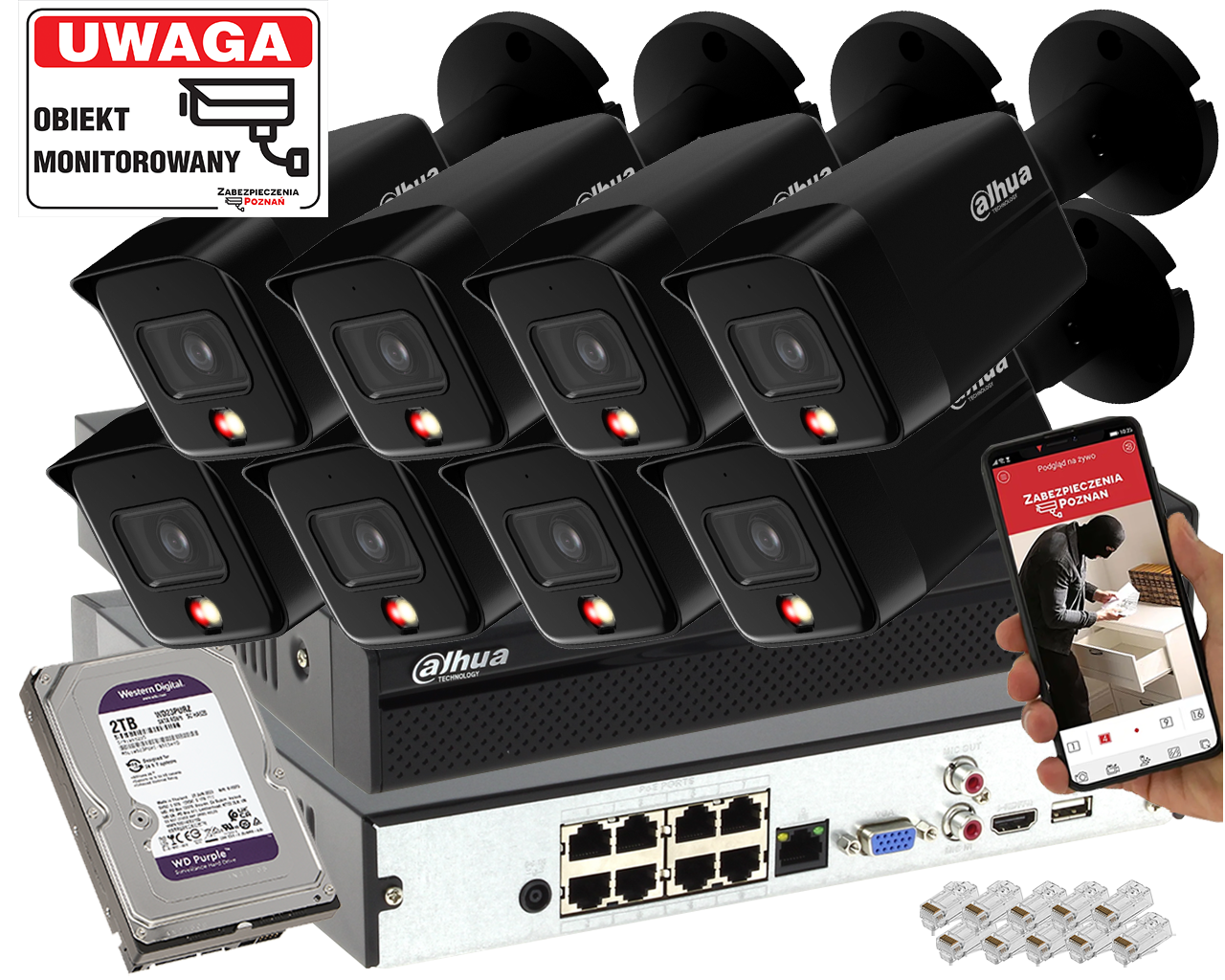 Zestaw monitoringu Domu 8 kamer IP Dahua IPC-HFW1639TC-A-IL-0280B-S6 BLACK 6MPx Podwójny oświetlacz