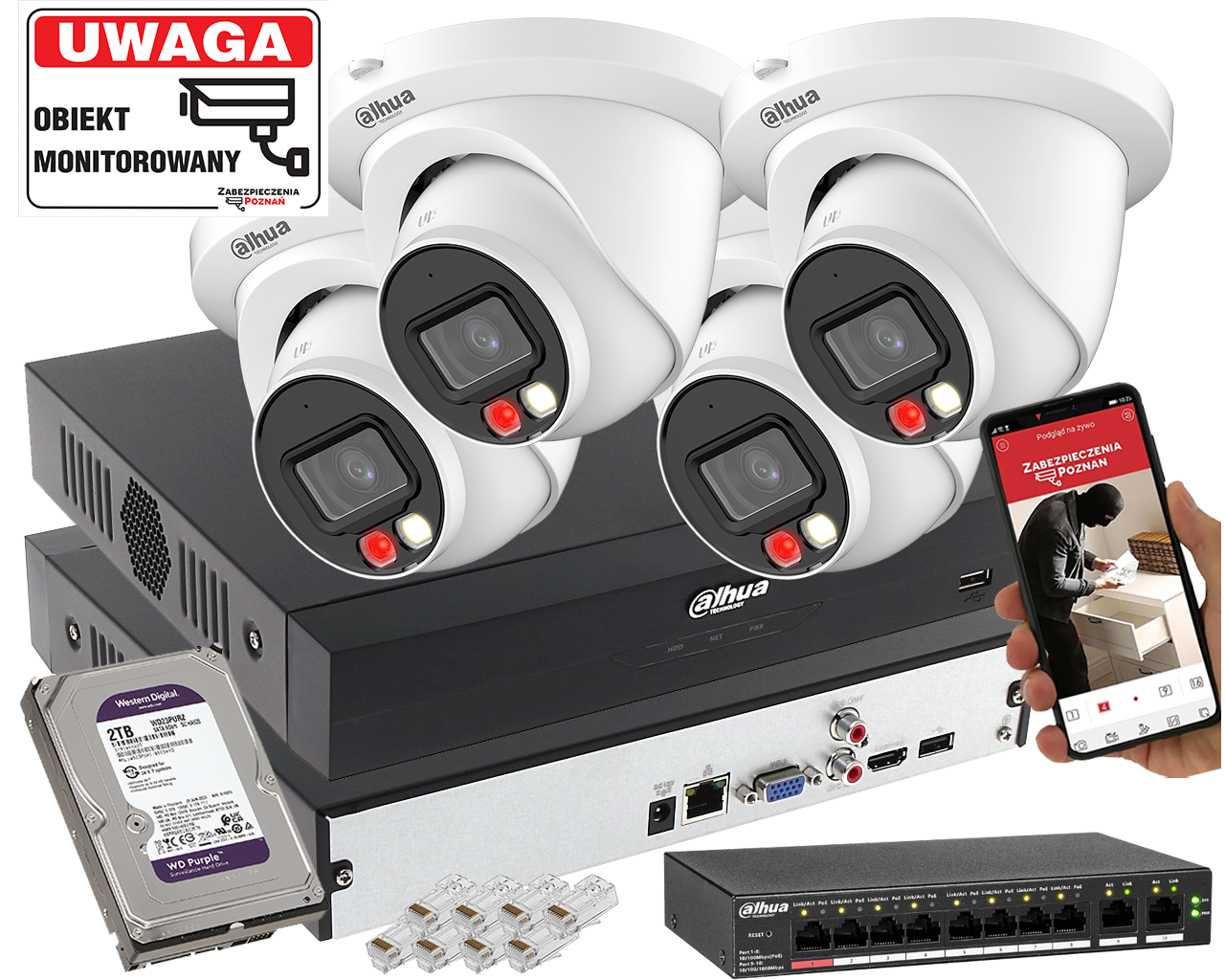 Prezentowany zestaw składa się z 4 kamer Dahua IPC-HDW2849TM-S-IL-0280B z serii WizSense S2 to profesjonalne kamery IP z inteligentną analizą obrazu. Wyposażone w obiektyw 2.8 mm i przetwornik 1/2.7” CMOS o rozdzielczości 8Mpx, obsługują kompresję H.265/H.264/MJPEG.