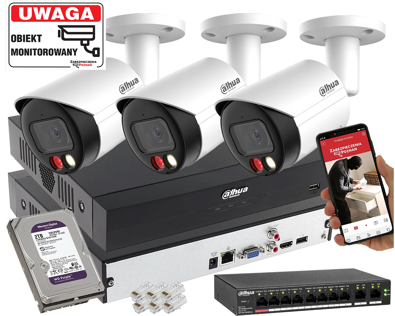 Prezentowany zestaw składa się z 3 kamer Dahua IPC-HFW2449S-S-IL-0280B z serii WizSense S2 to profesjonalne kamery IP z inteligentną analizą obrazu. Wyposażone w obiektyw 2.8 mm i przetwornik 1/2.7” CMOS o rozdzielczości 4Mpx, obsługują kompresję H.265/H.264/MJPEG.