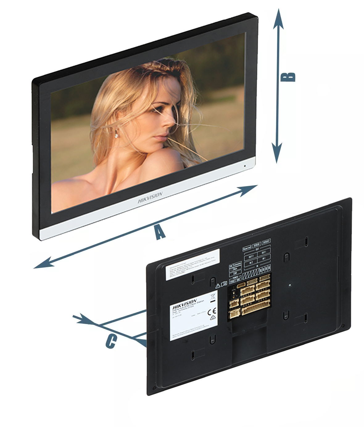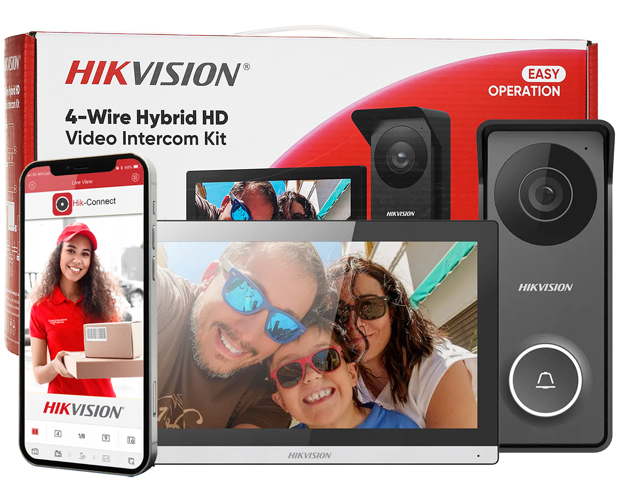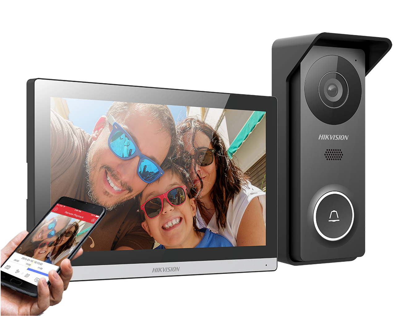 Monitor dotykowy w zestawie pozwala na prowadzenie dwukierunkowej komunikacji z panelami zewnętrznymi,sterowanie otwarciem drzwi oraz przekierowanie połączeń na smartfon za pośrednictwem aplikacji Hik-Connect.