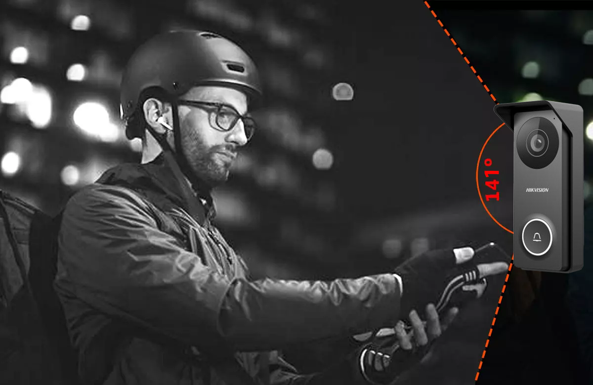 Stacja bramowa DS-KB2422T-IM została wyposażona w wysokiej klasy przetwornik CMOS 1/2.9" oraz obiektyw szerokokątny, który zapewnia bardzo rozległy kadr obserwacji: 117° w poziomie, 70° w pionie oraz 141° po przekątnej. Tak duży zakres widzenia umożliwia dokładne monitorowanie obszaru przed drzwiami, minimalizując ryzyko występowania martwych punktów.